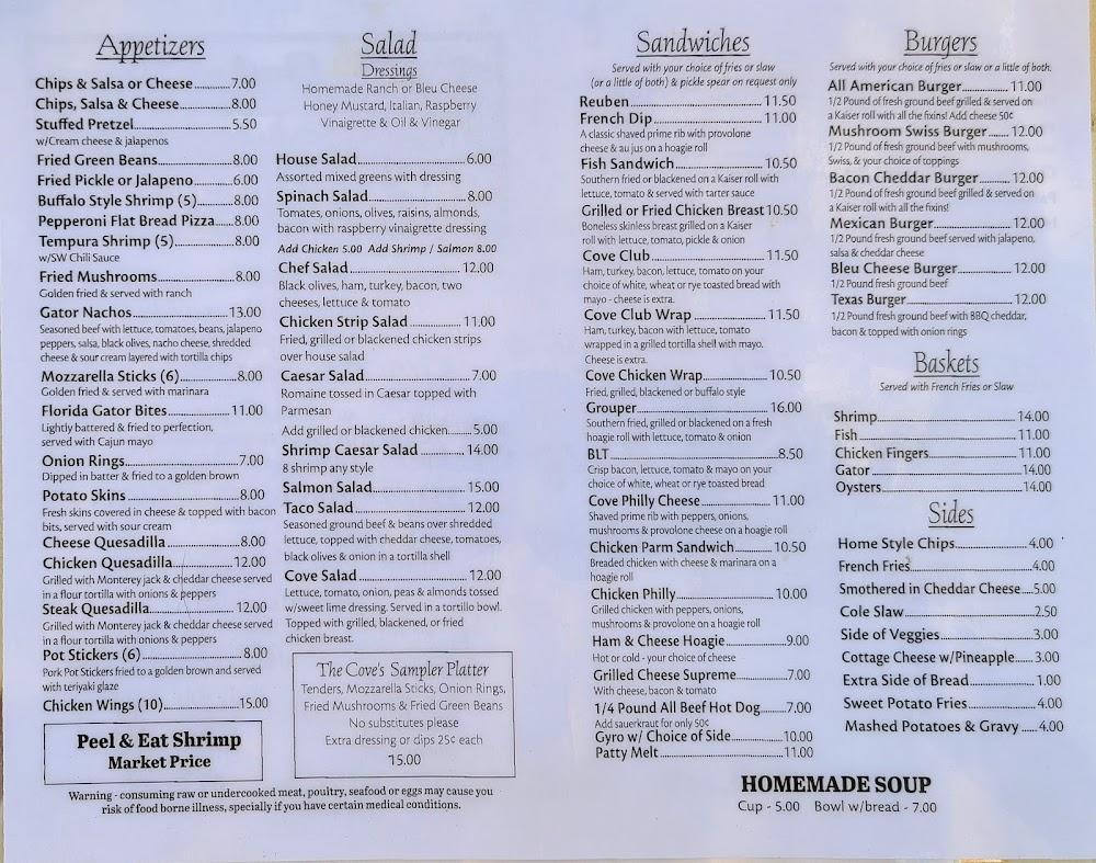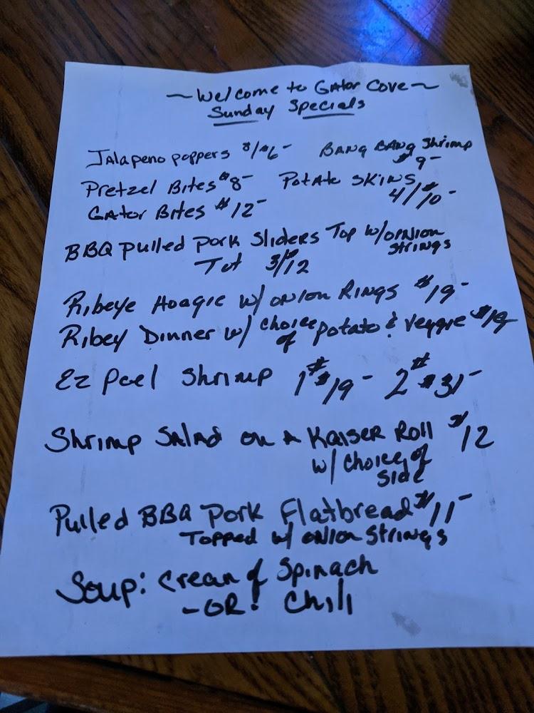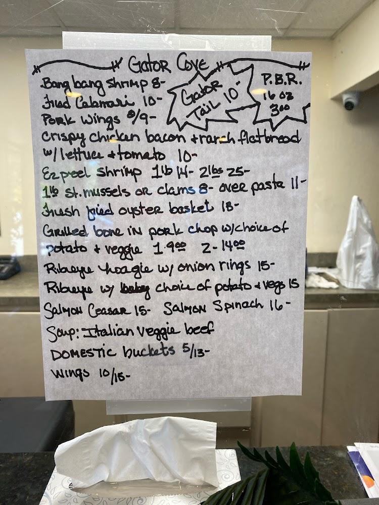 Gator Cove's menu serves classic American dishes with a local twist. Apps like mozzarella sticks and gator bites lead to excitement. Burgers, including the All American option, captivate patrons. Salads and sandwiches round out the offerings, providing variety. Prices hover around $10, making it affordable.