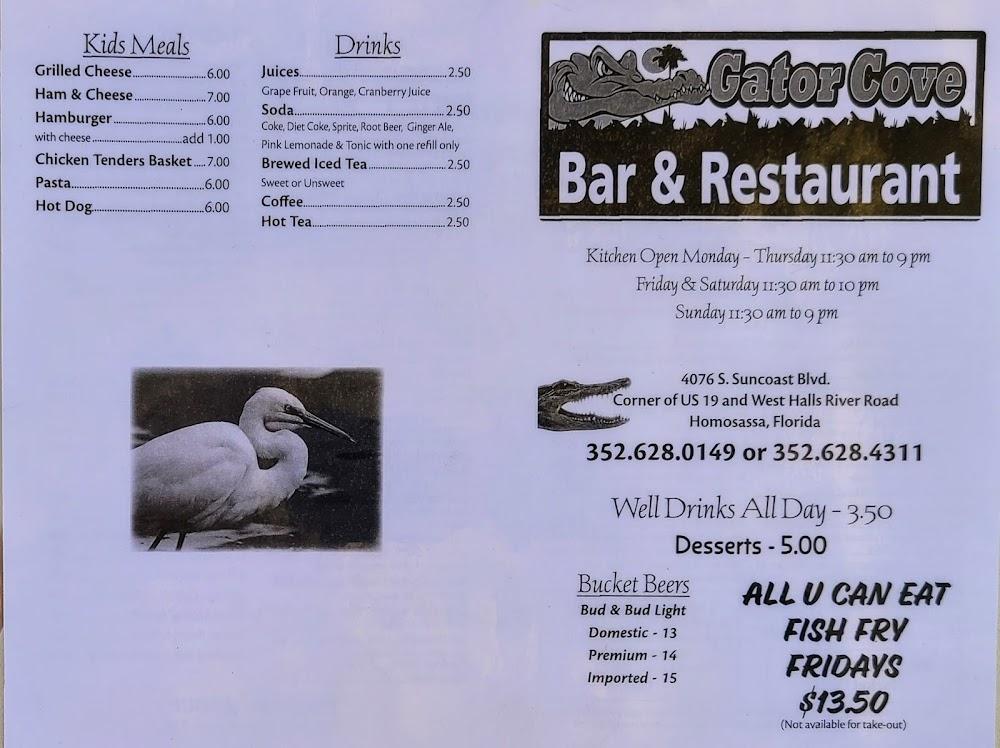 Welcome to Gator Cove, your go-to destination for mouthwatering American cuisine in Homosassa, Florida. Nestled on S Suncoast Blvd, we offer a vibrant dining experience with an extensive menu featuring local specialties and delicious cocktails. Enjoy our relaxing terrace while savoring a cold beer during happy hour, or indulge in our tasty lunch and dinner options. Our friendly staff is dedicated to providing fast service to enhance your visit, whether you're dining solo, with friends, or family. With accessible seating and parking, Gator Cove welcomes everyone to experience great food and a lively atmosphere. Join us today!